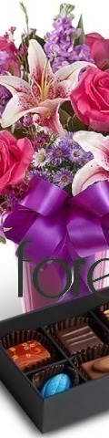6 Pink Roses, 5 Pink Stargazer Lilies, Purple Delphiniums, Purple Asters, Free 10 Pieces Assorted Chocolate