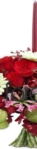 6 Red Roses, Red Mokkara Orchids, 3 White Gerbera, 5 Balloon Flowers, Gloriosa, 1 Red Candle